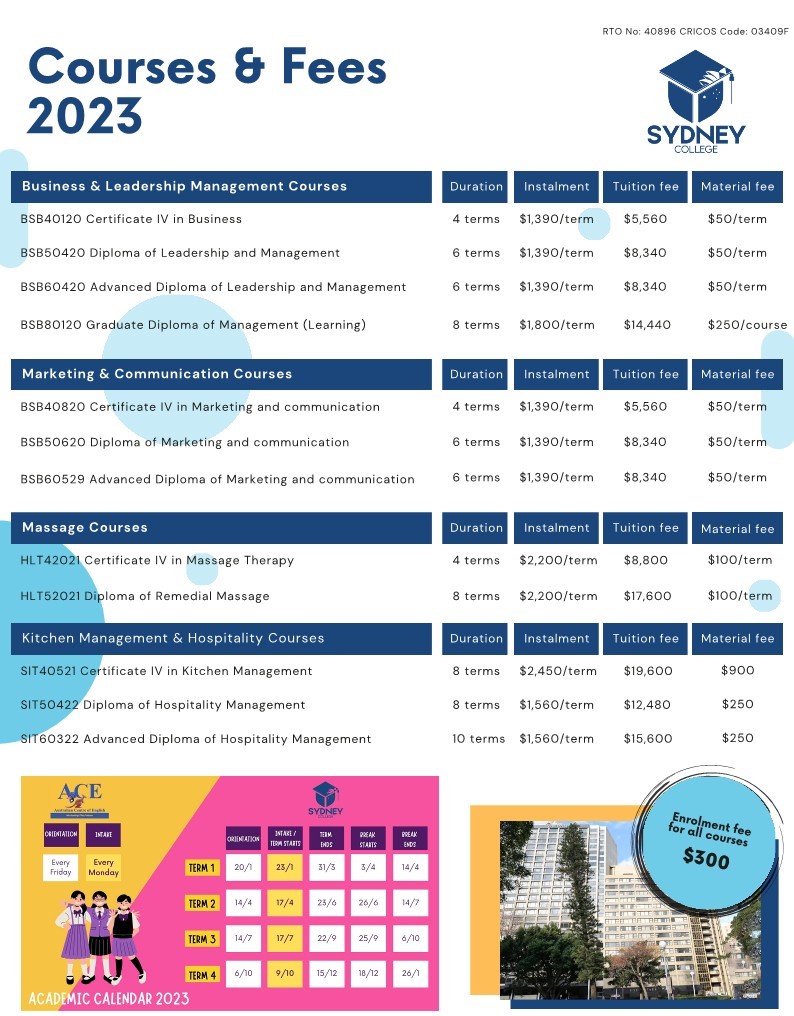 シドニーのアストリー語学学校からコース料金のお知らせです。