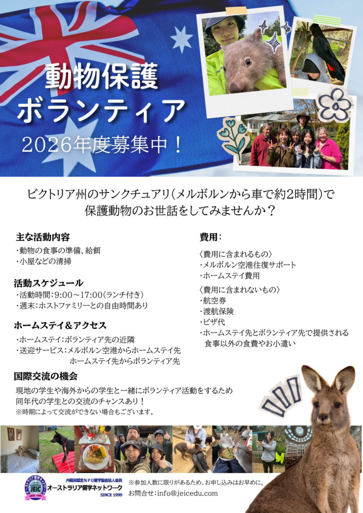 オーストラリアの大自然に囲まれた環境で、保護された動物たちのお世話をしながら、貴重なボランティア体験をしてみませんか?