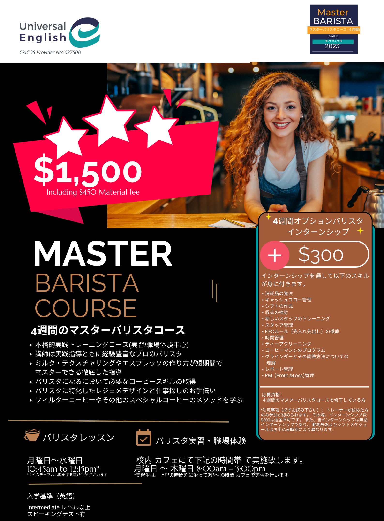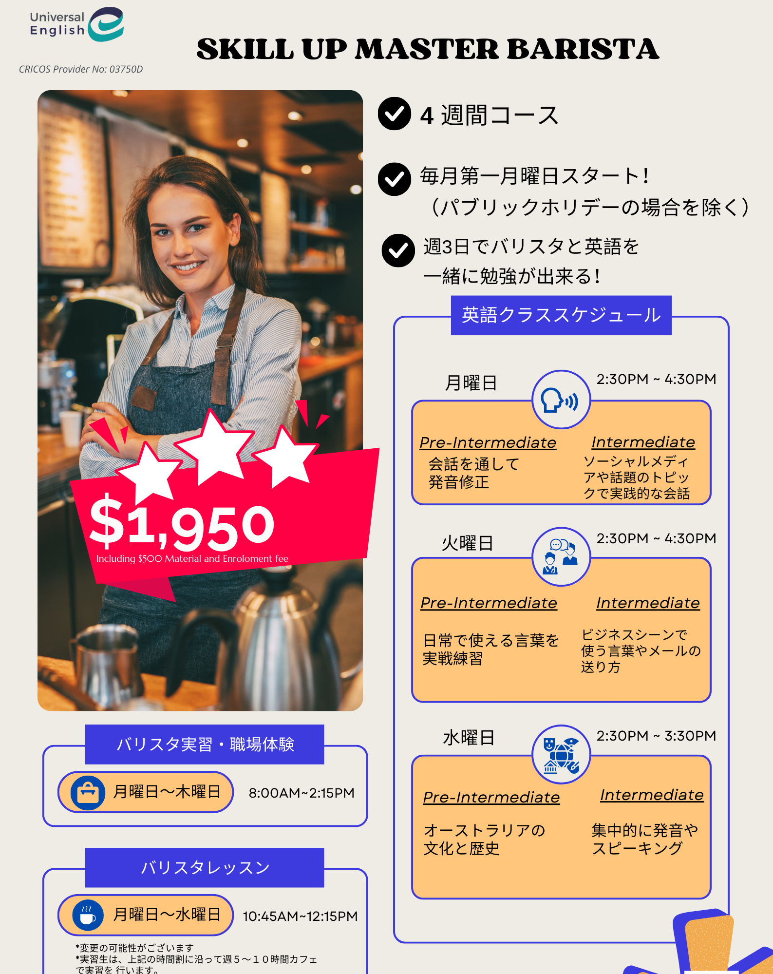 ・バリスタコース+英語クラス(AUD$1950)・バリスタコースのみ(AUD$1500)