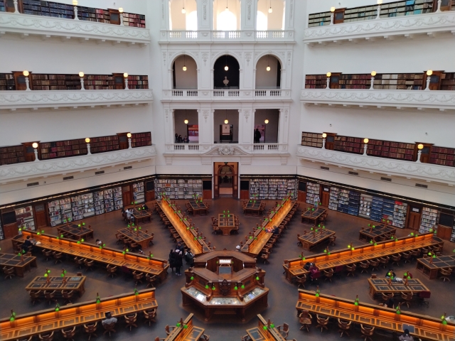メルボルンの交通の中心地である Flinders Street Station からバスで 7 分の所には State Library of Victoria と呼ばれる壮大で美しい図書館があります。蔵書約 200 万冊と共に閲覧用と勉強用の机と椅子、そして絵画がたくさんあり、学術と文化が融合した施設であることが伺えます。これまで 10 回行きました。
